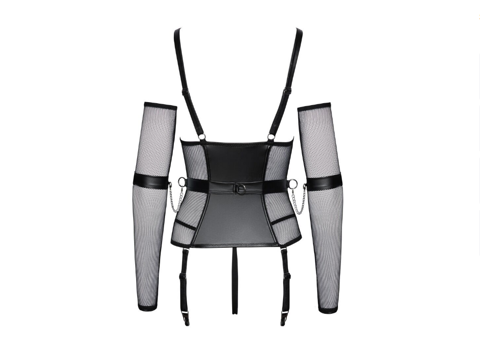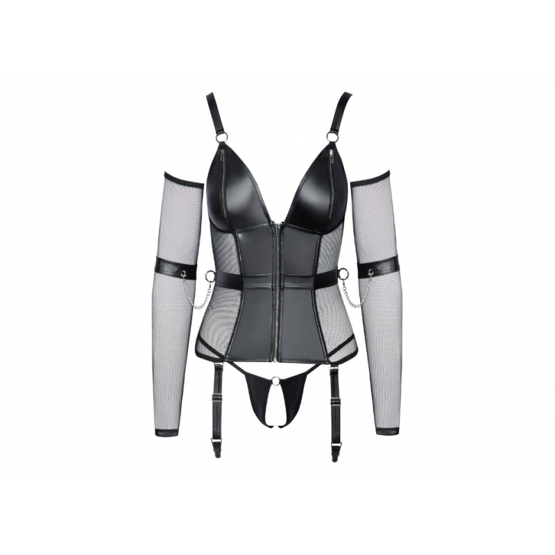 Les jarretières amovibles et ajustables ajoutent de la polyvalence à cette tenue captivante. Enfin, les longues manchettes en filet souple et le string ouvert à l'entrejambe, au design mat, viennent compléter cet ensemble provocant et élégant.