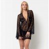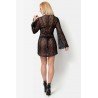 Entièrement conçue en dentelle noire délicate, la robe Fayence sublime vos courbes et dévoile vos plus beaux atouts avec élégance. Ses manches longues et amples, évasées au poignet, ajoutent une touche bohème chic tandis que son profond décolleté met en valeur la poitrine avec subtilité. Légère et transparente, cette robe invite au jeu de la séduction en laissant entrevoir votre lingerie ou votre nudité, selon vos envies.