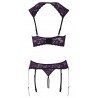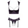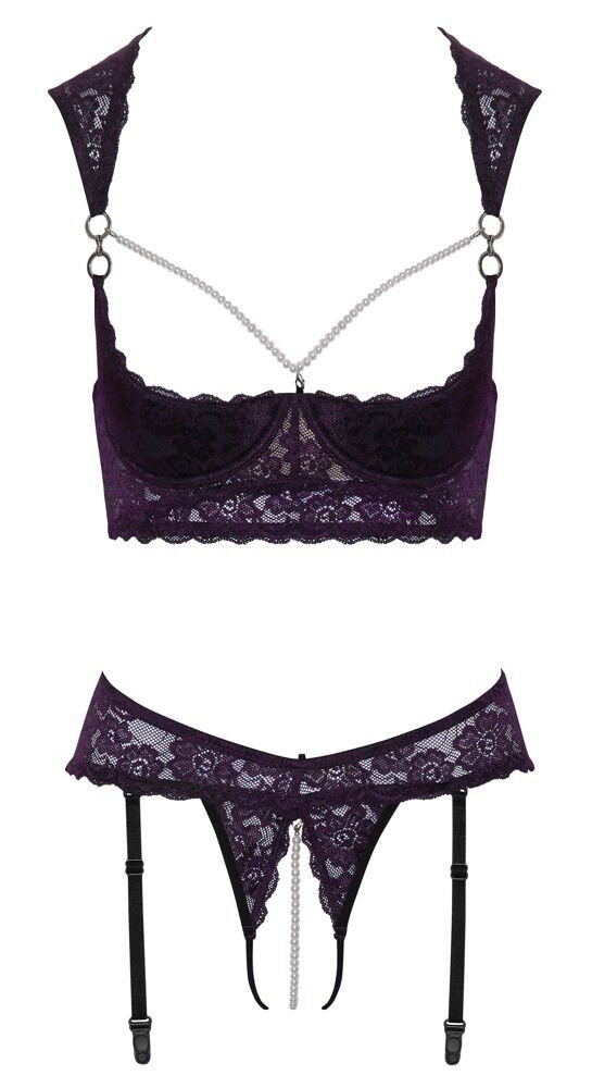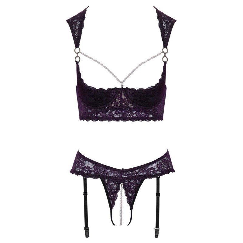 Composé d’un soutien-gorge longline à armatures et d’un string Rio à jarretelles ouvert, il associe une dentelle violette foncée raffinée à de subtils détails noirs, rehaussés d’anneaux argentés et de perles blanches. Les bonnets légèrement rembourrés galbent la poitrine et la mettent parfaitement en valeur, attirant naturellement tous les regards.