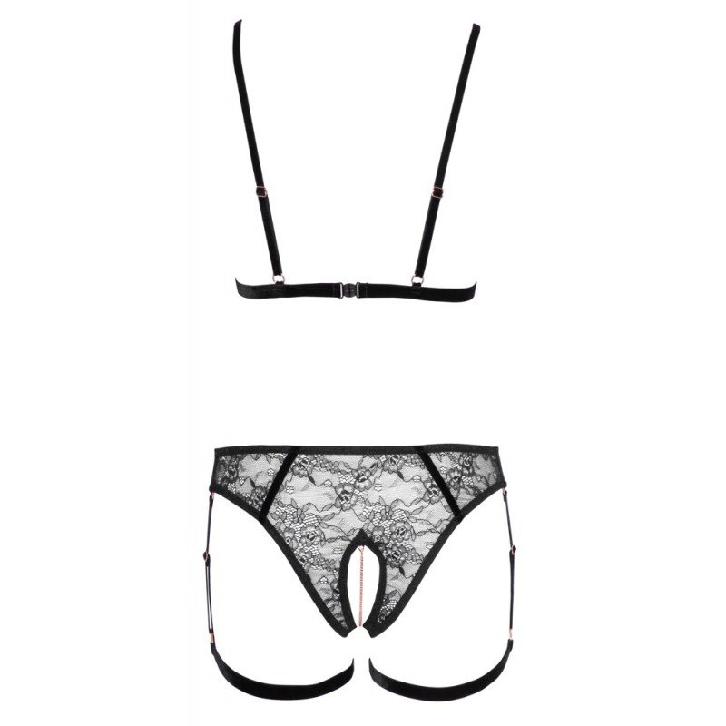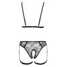 Le soutien-gorge souple dévoile la poitrine avec audace, tandis que la culotte, mêlant dentelle raffinée et entrejambe ouvert, invite au lâcher-prise.