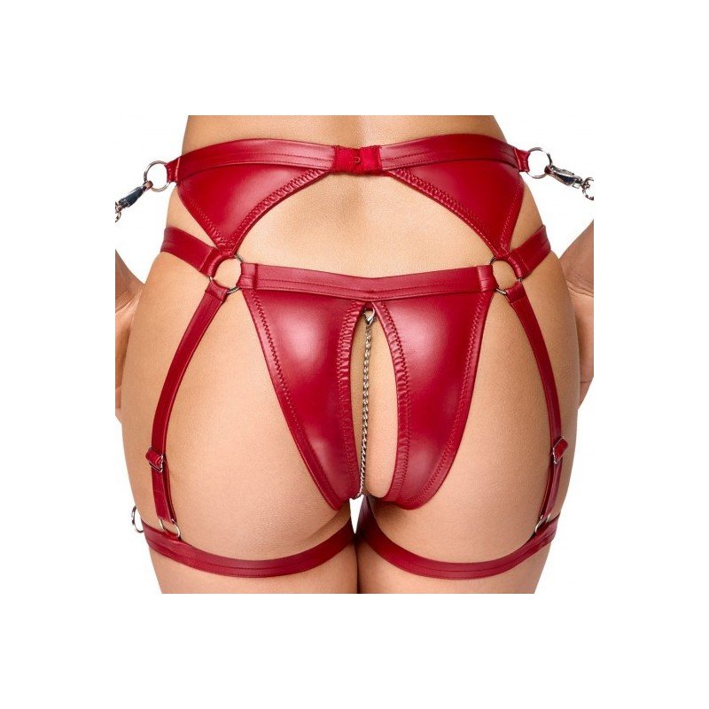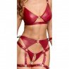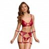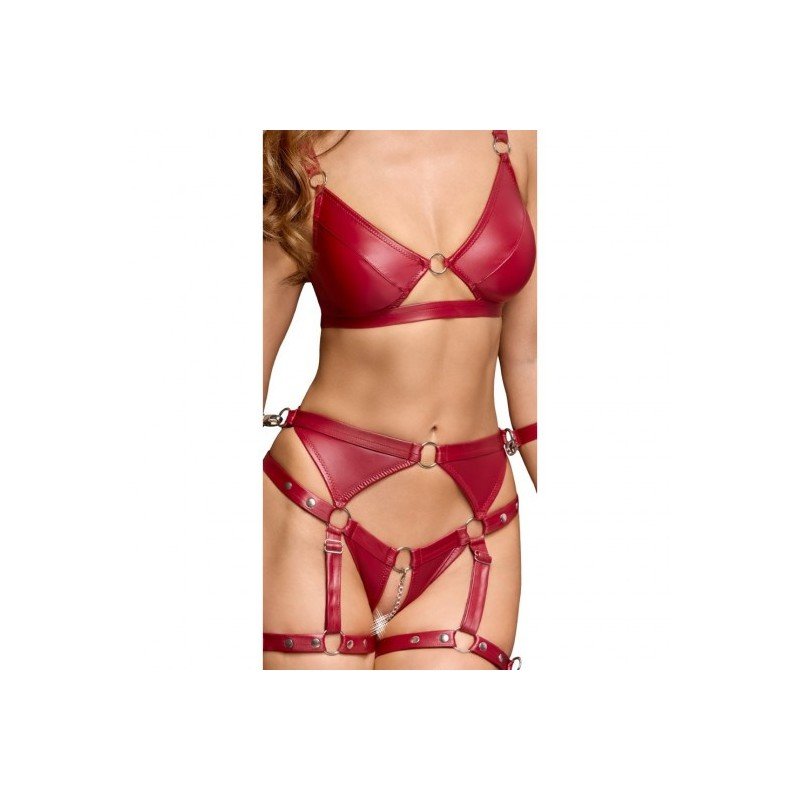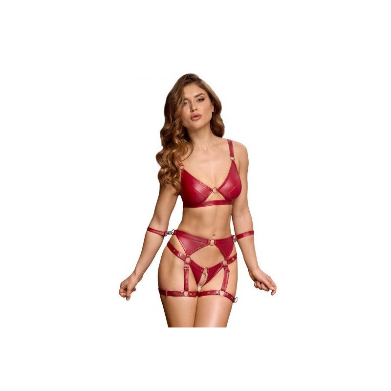 Cet ensemble complet mise sur un look rouge mat provocant et des détails métalliques argentés.