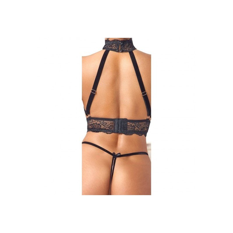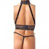 Ce duo se compose d'un top audacieux révélant la poitrine et d'un string coordonné à l'entrejambe ouvert.