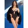 Ce body tout en dentelle et tissu transparent sera l'allié de vos soirées brûlantes... Son entrejambe ouvert appelle à toutes les folies, tandis que les lanières situées sur le décolleté mettront vos formes en valeur pour un moment coquin plein de sensualité. Le ruban cousu devant accentue la taille, tandis que l'ouverte à l'arrière mettra en valeur vos hanches.