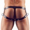 Ses sangles effet cuir noir, ornées de rivets métalliques, dessinent les lignes du corps et mettent en valeur la silhouette masculine avec audace et élégance.