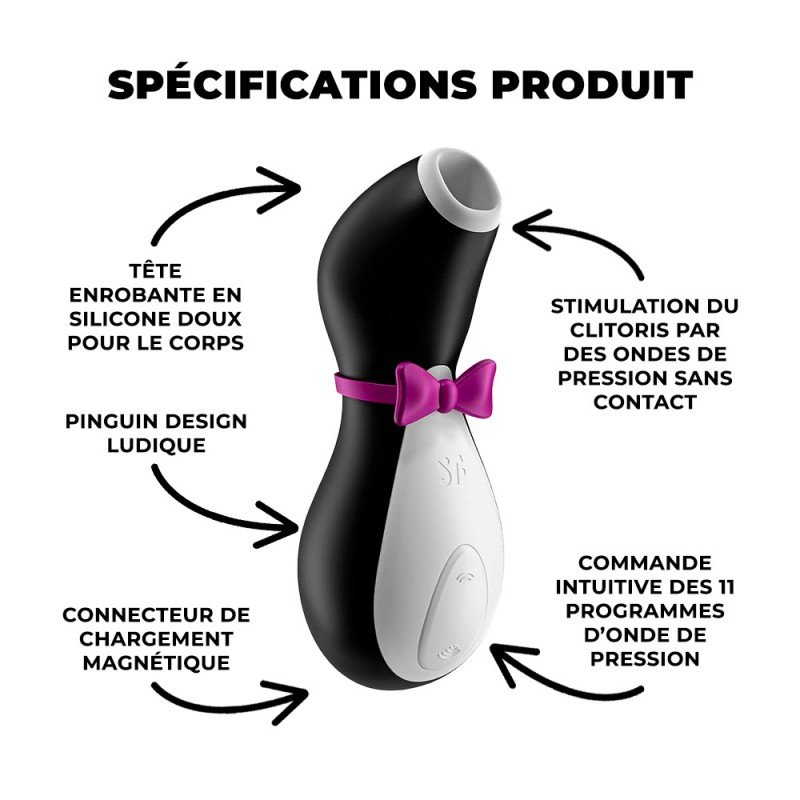 Le Satisfyer Pro Penguin est un sextoy révolutionnaire qui offre une expérience sensorielle inégalée. Ce stimulateur clitoridien se démarque par sa technologie avancée de stimulation par ondes de pression sans contact, offrant des orgasmes intenses et multiples. Son design unique, évoquant un gentleman en costume avec nœud papillon, ajoute une touche d'originalité et de charme.